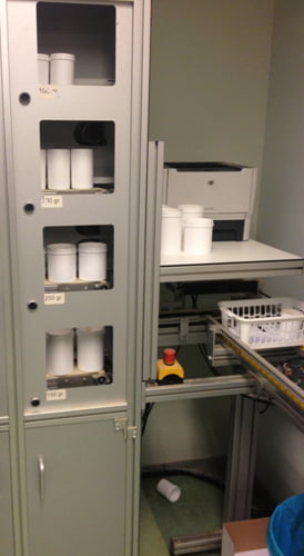 The system combines an efficient storage/inventory system of bulk ingredients in cassettes (up to several hundred), bulk prescription bottles, a high-speed robotic arm, and software to control the inventory and mixing of each prescription. The TCM robotic arm selects the right size bottle and calculates the correct selection and amount of ingredients, by ultra-precise weighing. Then the robotic arm brings the bottle to each of the necessary ingredient cassettes and dispenses exact measurements one after the other until the mixture is completed. The robotic arm delivers the bottle to a barcoded tote, for the final inspection.